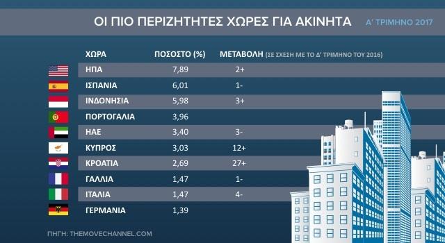 Πρώτη σε αναζήτηση προορισμός για τους αγοραστές ακινήτων είναι οι ΗΠΑ, με ποσοστό 7,9%, ενώ ακολουθούν η Ισπανία και η Ινδονησία καταλαμβάνοντας το 6,01% και 5,98% αντίστοιχα.