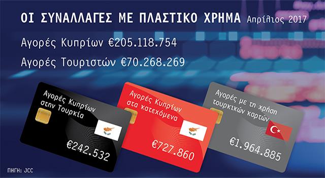 Την ίδια ώρα, οι δαπάνες των Κυπρίων στην Τουρκία με τη χρήση πλαστικού χρήματος ανήλθαν στις €243 χιλιάδες τον Απρίλιο του 2017 εκ των οποίων οι €59 χιλιάδες ξοδεύτηκαν για την αγορά ρουχισμού και €54 χιλιάδες για την αγορά αεροπορικού εισιτηρίου.