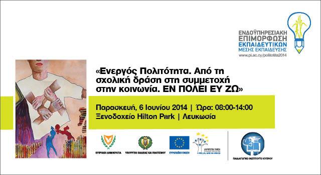 Το Παιδαγωγικό Ινστιτούτο, σε συνεργασία με τις Διευθύνσεις Μέσης Γενικής και Μέσης Τεχνικής και Επαγγελματικής Εκπαίδευσης παρουσιάζουν το Συνέδριο: «Ενεργός Πολιτότητα. Από τη σχολική δράση στη συμμετοχή στην κοινωνία. ΕΝ ΠΟΛΕΙ ΕΥ ΖΩ» την Παρασκευή 6 Ιουνίου 2014 στο ξενοδοχείο Hilton Park στη Λευκωσία.