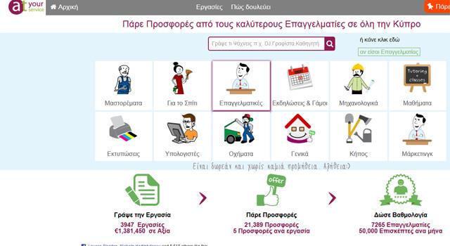 Μέσα σε 18 μήνες λειτουργίας της ιστοσελίδας AtYourService έχουν ήδη γίνει εργασίες συνολικής αξίας πέραν του €1,500,000. Ο χρήστης γράφει τι χρειάζεται και λαμβάνει προσφορές από τις 7200 Εταιρείες και Επαγγελματίες στην Κύπρο, που δίνουν τις προσφορές τους στην ιστοσελίδα.