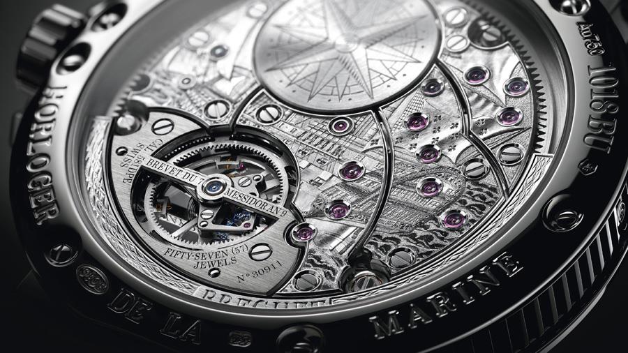 Βασισμένο στην αυτόματη Calibre 581DR, το νέο μοντέλο Marine Équation Marchante της Breguet επίσης επιδεικνύει μια τρίτη αξιοσημείωτη πολυπλοκότητα: ένα tourbillon 60 δευτερολέπτων τοποθετημένο σε περίβλημα από τιτάνιο με ταλαντωτή Breguet και ελατήριο από οξείδιο του πυριτίου.