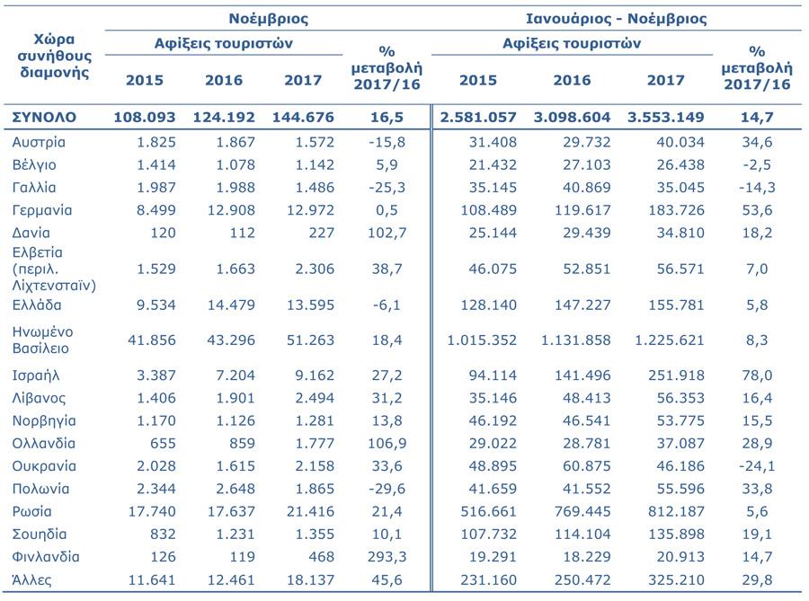 Για την περίοδο Ιανουαρίου – Νοεμβρίου 2017 οι αφίξεις τουριστών ανήλθαν σε 3.553.149 σε σύγκριση με 3.098.604 την αντίστοιχη περίοδο του 2016, σημειώνοντας αύξηση 14,7% αλλά και ξεπερνώντας τις αφίξεις που καταγράφηκαν ποτέ στην Κύπρο κατά τους πρώτους έντεκα μήνες του έτους (Πίνακας 1).