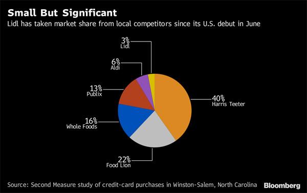 Από την άλλη πλευρά, η Aldi, καθιερωμένη στη γερμανική αγορά από το 1976, διπλασίασε τα καταστήματα της στις ΗΠΑ το 2017 προκαλώντας νέες πιέσεις στην αγορά και ιδιαίτερα στους πιο παραδοσιακούς «παίκτες», όπως η Wal-Mart και η Kroger.
