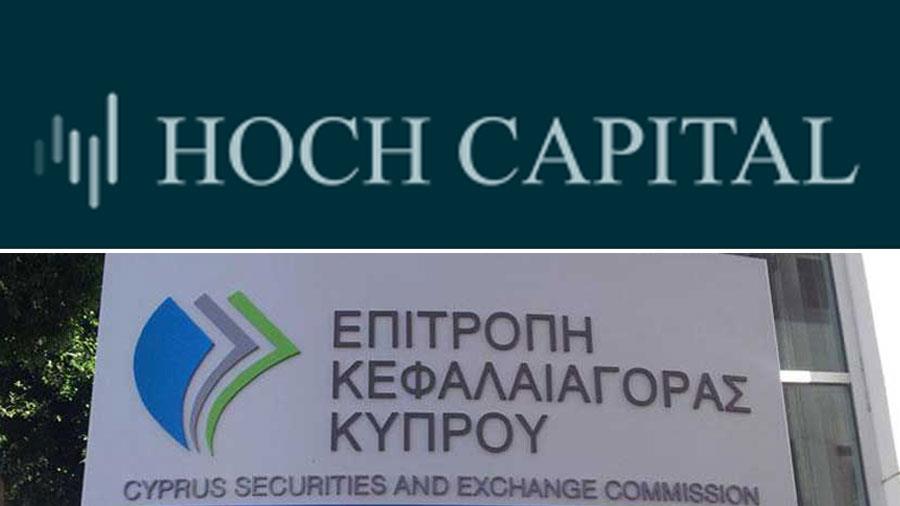 Την επιβολή διοικητικού προστίμου ύψους €30.000 στην ΚΕΠΕΥ Hoch Capital Ltd αποφάσισε το Συμβούλιο της Επιτροπής Κεφαλαιαγοράς Κύπρου σε συνεδρία του στις 20 Νοεμβρίου 2017 για μη συμμόρφωση με το άρθρο 36(1)(α) του περί Επενδυτικών Υπηρεσιών και Δραστηριοτήτων και Ρυθμιζόμενων Αγορών Νόμου του 2007 και την παράγραφο 6(2) της Οδηγίας ΟΔ 144- 2007-02 του 2012 της Επιτροπής Κεφαλαιαγοράς για την Επαγγελματική Συμπεριφορά των ΕΠΕΥ και των Απασχολούμενων σε αυτές Φυσικών Προσώπων.