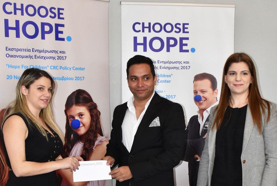 Ιδιαίτερα συγκινητική ήταν η ανταπόκριση του κοινού στην εκστρατεία «Choose Hope» του Οργανισμού «Hope For Children» CRC Policy Center τον περασμένο Νοέμβριο. Η εκστρατεία πραγματοποιήθηκε με τη στήριξη των Υπεραγορών ΑΛΦΑΜΕΓΑ, Διαχρονικού Χορηγού του «Hope for Children» και της Action Global Communications και αποσκοπούσε στην οικονομική ενίσχυση του Οργανισμού για τη στήριξη των δράσεων του που επικεντρώνονται στην προστασία των δικαιωμάτων των παιδιών. Κεντρικό στοιχείο της εκστρατείας ήταν οι μπλε μυτούλες που συμβολίζουν την ελπίδα και την ευαισθησία προς τα παιδιά. Σήμερα, οι Υπεραγορές ΑΛΦΑΜΕΓΑ παρέδωσαν στον Οργανισμό ποσό ύψους των  €42.902 που αναλογούν στις  πωλήσεις 21.451 μυτούλων.