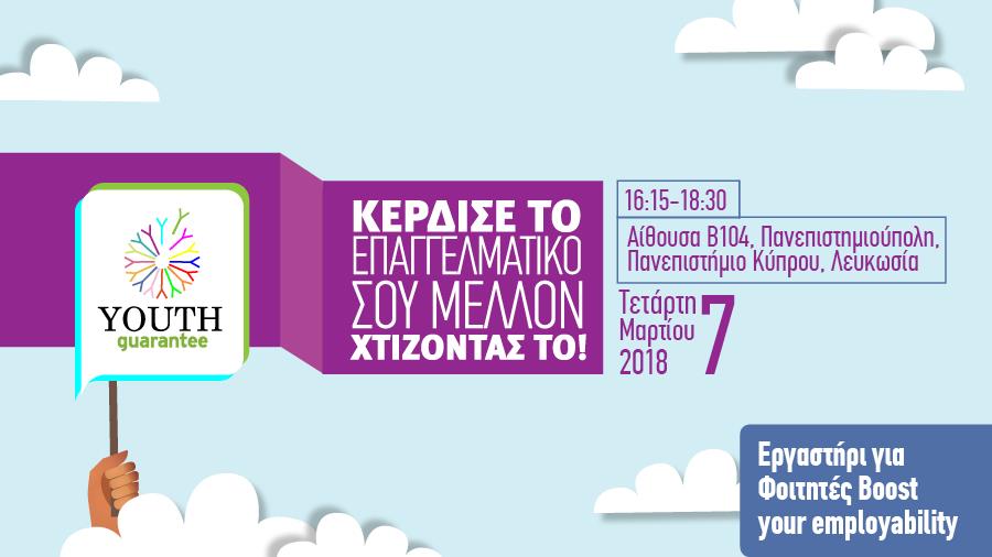 Είσαι φοιτητής κι ενδιαφέρεσαι για τα προγράμματα εργοδότησης, κατάρτισης κι εκπαίδευσης που τρέχουν στην Κύπρο; Άδραξε την ευκαιρία κι ενημερώσου για το πρόγραμμα “Youth Guarantee”. Λάβε γνώση κι εμπειρία από Εκπαιδευτές Μη Τυπικής Μάθησης της ομάδας εκπαιδευτών του Συμβουλίου Νεολαίας, στο αντίστοιχο Εργαστήρι για φοιτητές με τίτλο Boost your employability. Το Εργαστήρι θα πραγματοποιηθεί την Τετάρτη 7 Μαρτίου 2018, στην Αίθουσα ΧΩΔ02 Β104 στην Πανεπιστημιούπολη, Πανεπιστήμιο Κύπρου, Λευκωσία.