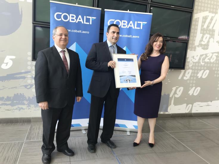 Σε τελετή που πραγματοποιήθηκε σήμερα στο αεροδρόμιο Λάρνακας ο Andrew Madar Εκτελεστικός Διευθυντής της Cobalt Air  παρέλαβε από την Διευθύντρια Δημοσίων Σχέσεων της Ευρώπης για την IATA Νικόλ Μπουσιώτη, το σχετικό πιστοποιητικό.