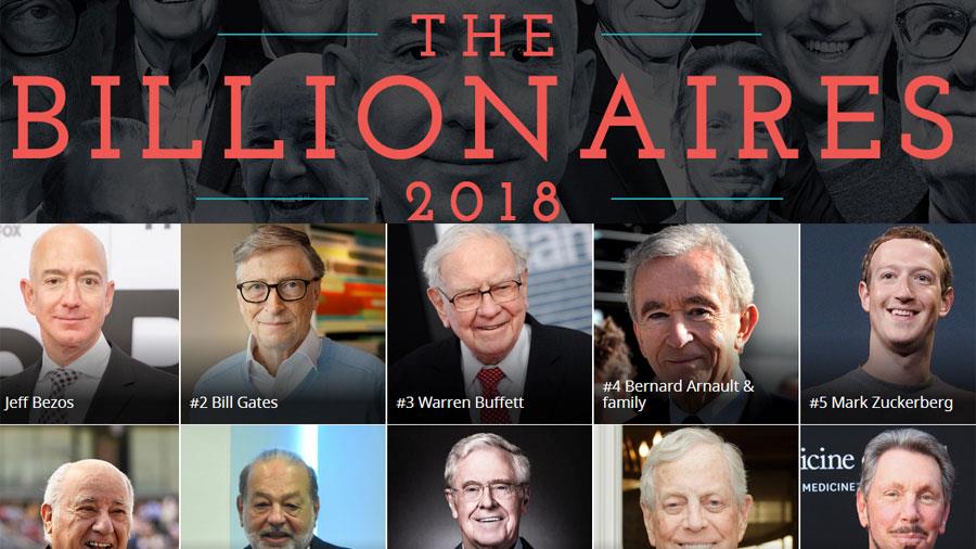 Η λίστα των δισεκατομμυριούχων του Forbes αποτυπώνει την περιουσία των πλουσιότερων ανθρώπων στον κόσμο, όπως αυτή καταγράφηκε στις 9 Φεβρουαρίου 2018. Η φετινή 32η ετήσια λίστα περιλαμβάνει 2.208 δισεκατομμυριούχους, εκ των οποίων οι 585 προέρχονται από τις ΗΠΑ. Ση δεύτερη θέση βρίσκεται η Κίνα, και ακολουθούν η Γερμανία, η Ινδία και η Ρωσία.