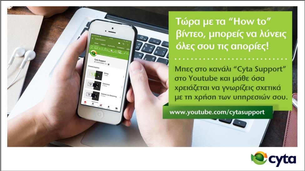 Η Cyta εμπλουτίζει σταθερά και με συνέπεια την εξυπηρέτηση που προσφέρει στους πελάτες της μέσα από διάφορα κανάλια και ιδιαίτερα τα κοινωνικά δίκτυα. Αξιοποιώντας την καθημερινή επαφή που έχει μαζί τους μέσω του Κέντρου Τηλεξυπηρέτησης και άλλων σημείων επικοινωνίας και μελετώντας συνεχώς τις πιο συχνές ερωτήσεις που λαμβάνει για τις υπηρεσίες και τον εξοπλισμό της, δημιούργησε μικρά, επεξηγηματικά («How to») βίντεο και τα διαθέτει στο κοινό, μέσω του καναλιού Cyta Support στο YouTube: www.youtube.com/cytasupport