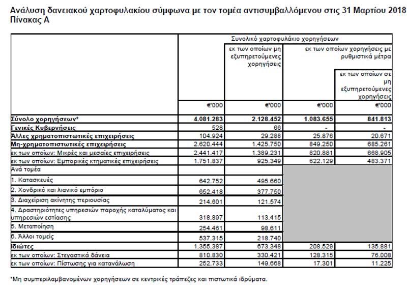 Αξίζει να σημειωθεί πως το δανειακό χαρτοφυλάκιο της Ελληνικής στο σύνολο του ανερχόταν στα €4.086 εκατ., αυξάνοντας το μερίδιο της από 7,7%ω το 2016 σε 8,5% το πρώτο τρίμηνο του 2018. Από το σύνολο των χορηγήσεων τα €1.314 εκατ. αφορούν συσσωρευμένες ζημιές απομείωσης.