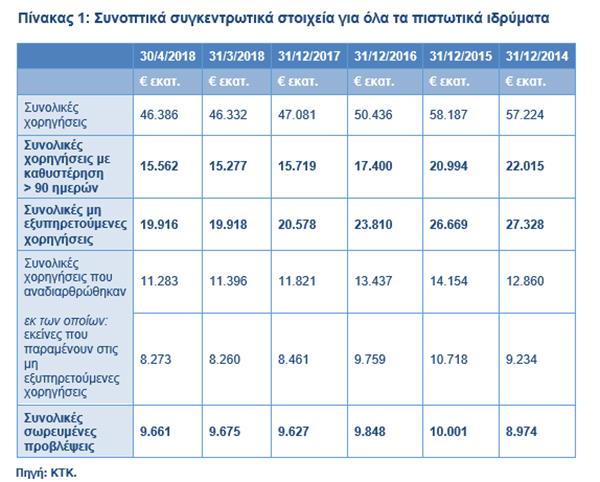 Συγκεκριμένα, σύμφωνα με στοιχεία της Κεντρικής Τράπεζας οι συνολικές χορηγήσεις κατά τον μήνα Απρίλιο ανέρχονταν στα €43,38 δις μειωμένες κατά €695 εκατ. σε σχέση με τον Δεκέμβριο του 2017. Σε ό,τι αφορά το σύνολο των μη εξυπηρετούμενων χορηγήσεων τον Απρίλιο διαμορφώθηκαν στα €19.916 εκατ. μειωμένες κατά μόλις €2 εκατ. σε σχέση με τον προηγούμενο μήνα.