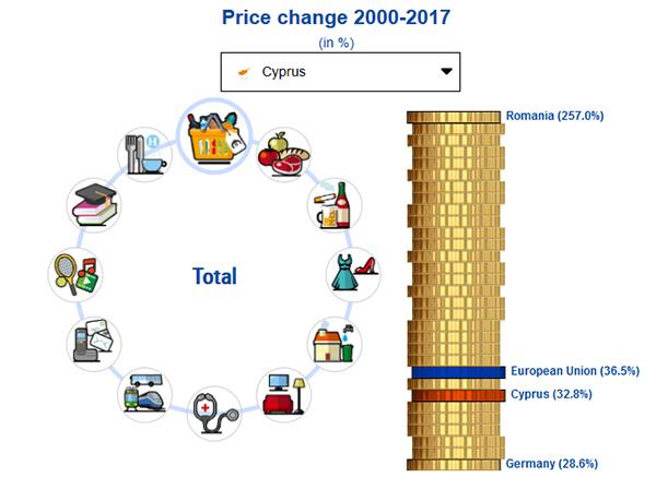 Το αντίτιμο προϊόντων και υπηρεσιών στην Κύπρο αυξήθηκε κατά μέσο όρο 32,8% το 2017 σε σχέση με το 2000, λίγο πιο κάτω από τον μέσο όρο της Ευρωπαϊκής Ένωσης που κυμαίνεται στο 36,5%. Σύμφωνα με την Ευρωπαϊκή Στατιστική Υπηρεσία η μεγαλύτερη αύξηση στις τιμές προϊόντων και υπηρεσιών από την είσοδο του millennium καταγράφηκε στην Ρουμανία όπου σημειώθηκε αύξηση 257%, ενώ η μικρότερη αύξηση καταγράφηκε στην Γερμανία όπου σε σχέση με το 2000 το 2017 οι τιμές αυξήθηκαν κατά 28,6%.