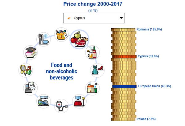 Σε ό,τι αφορά τις κατηγορίες προϊόντων στην Κύπρο οι τιμές των προϊόντων στην κατηγορία τροφίμων και μη αλκοολούχων ποτών ήταν αυξημένες κατά 62,6% το 2017 σε σχέση με το 2000, ενώ ο μέσος όρος στην ΕΕ ανήλθε στο 43,3%. Η μικρότερη αύξηση στις τιμές της εν λόγω κατηγορίας σημειώθηκε στην Ιρλανδία (7,3%).
