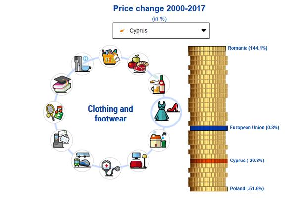 Μειωμένες κατά 20,8% είναι οι τιμές των ειδών ένδυσης και υπόδησης το 2017 σε σχέση με το 2000, ενώ στην ΕΕ ο μέσος όρος ήταν 0,8% με την μεγαλύτερη μείωση 51,6% να καταγράφεται στην Πολωνία.