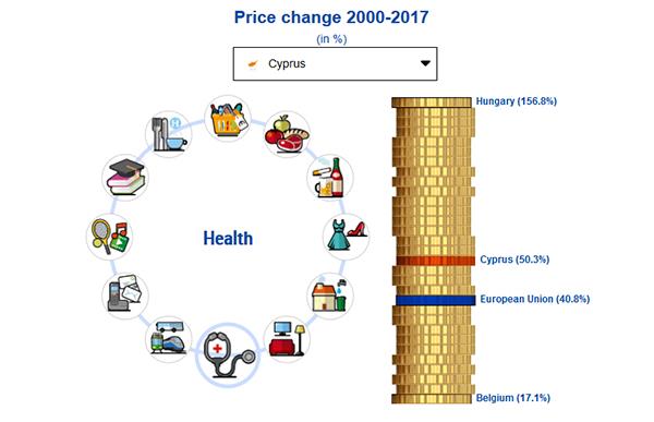 Το αντίτιμο που κατέβαλλαν το 2017 οι κάτοικοι Κύπρου για την εξασφάλιση υπηρεσιών υγείας αυξήθηκε κατά 50,3% σε σχέση με το 2000, ενώ κατά μέσο όρο οι Ευρωπαίοι κατέβαλλαν αυξημένο αντίτιμο κατά 40,8%. Η μεγαλύτερη αύξηση σημειώθηκε στην Ουγγαρία (153%) και η μικρότερη στο Βέλγιο (17,1%).