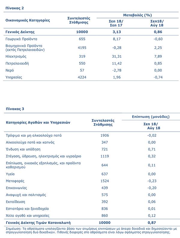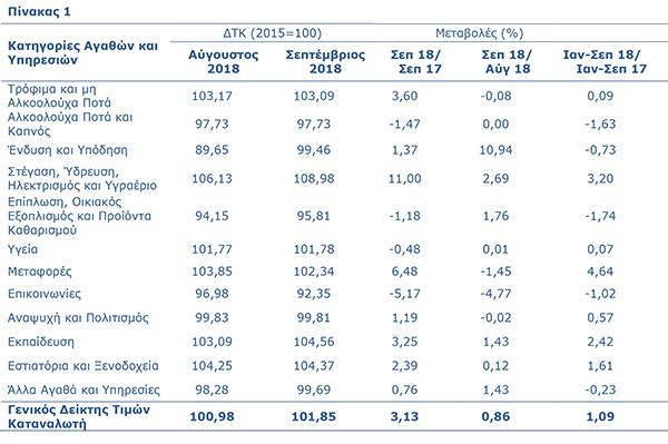 Ο Δείκτης Τιμών Καταναλωτή το Σεπτέμβριο 2018 αυξήθηκε κατά 0,87 μονάδες και έφτασε στις 101,85 μονάδες σε σύγκριση με 100,98 μονάδες τον Αύγουστο 2018. Σύμφωνα με την Στατιστική Υπηρεσία, σε σχέση με το Σεπτέμβριο του 2017 ο ΔΤΚ αυξήθηκε κατά 3,1% ενώ για την περίοδο Ιανουαρίου – Σεπτεμβρίου 2018, ο ΔΤΚ σημείωσε αύξηση 1,1% σε σύγκριση με την αντίστοιχη περσινή περίοδο.
