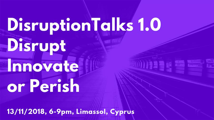 Προσκαλούνται όλα τα καινοτόμα μυαλά ή όσους θέλουν να μάθουν περισσότερα για καινοτομία στις 13 Νοεμβρίου 2018 στο Αμφιθέατρο 1 – Κτίριο Τάσσος Παπαδόπουλος στην Λεμεσό. Η εκδήλωση θα αρχίσει ακριβώς στις 6μμ και θα διεξαχθεί στην Αγγλική γλώσσα. Οι προεγγραφές ήδη έχουν αρχίσει μέσω διαδικτύου στο www.DisruptionTalks.com