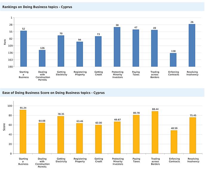 Η έναρξη μιας επιχείρησης στην Κύπρο απαιτεί πέντε διαδικασίες που διαρκούν πέντε ημέρες με χρέωση που ανέρχεται στο 11,9% του Κατά Κεφαλήν Εισοδήματος (ΚΚΕ) και με καταβεβλημένο ελάχιστο κεφάλαιο 0% του ΚΚΕ. Συγκεκριμένα, η Κύπρος κατατάσσεται στην 52η θέση.