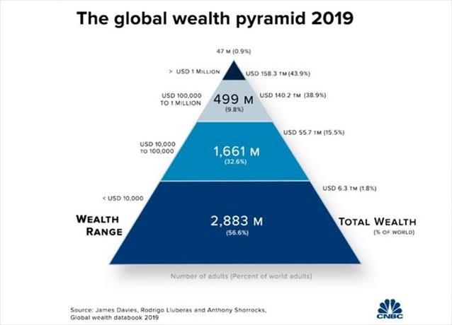 Οι 46,8 εκατομμύρια εκατομμυριούχοι της Γης εμφανίζουν αθροιστικά περιουσία ύψους 158,3 τρισ. δολαρίων- ποσό που αντιστοιχεί στο 44% του παγκόσμιου πλούτου.