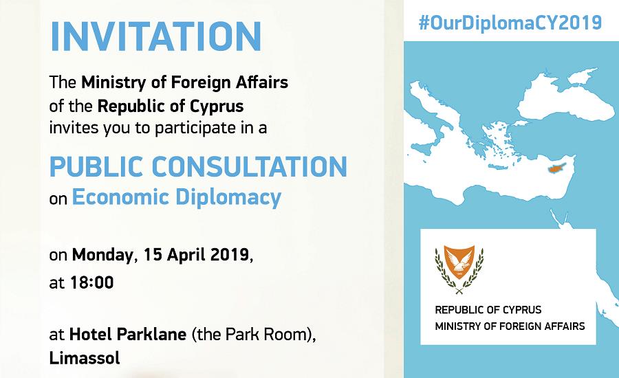 Το Υπουργείο Εξωτερικών, στο πλαίσιο της πολιτικής για ενίσχυση και διεύρυνση του διαλόγου με την κοινωνία των πολιτών, ανακοινώνει τη διοργάνωση Δημόσιας Διαβούλευσης με αντικείμενο την Οικονομική Διπλωματία, η οποία θα πραγματοποιηθεί τη Δευτέρα, 15 Απριλίου 2019, στις 6.00 μ.μ., στο Ξενοδοχείο Parklane στη Λεμεσό.