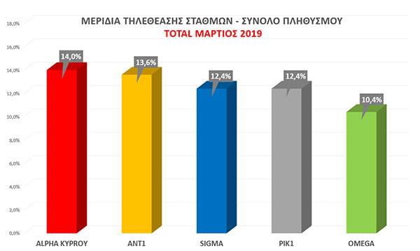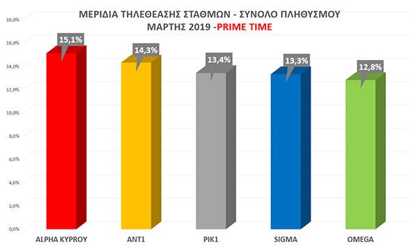 Για δεύτερο συνεχόμενο μήνα ο ALPHA Κύπρου κατάφερε να είναι πρώτος σε γενική τηλεθέαση αλλά και στην σημαντική Prime Time ζώνη. Για ολόκληρο το μήνα Μάρτιο ο ALPHA Κύπρου κατάφερε να ξεχωρίσει ως πρώτο κανάλι σε σύνολο πληθυσμού, καταγράφοντας μάλιστα εξαιρετικές επιδόσεις σε όλα τα Κοινά.