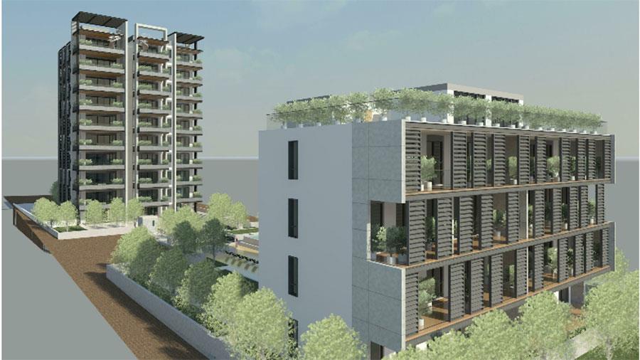 Το κτήριο “BlockA” αποτελείται από 9 ορόφους (συνολικό ύψος 44.850m) και περιλαμβάνει 26διαμερίσματα (8 διαμερίσματα ενός υπνοδωματίου,8διαμερίσματα δυο υπνοδωματίων και 10διαμερίσματα τριών υπνοδωματίων), κήπο στην οροφή, χώρους αναμονής, καταστήματα και μηχανοστάσιο. Το κτήριο “BlockΒ” αποτελείται από 4 ορόφους (συνολικό ύψος 25.600 m) και περιλαμβάνει 8 διαμερίσματα τριών υπνοδωματίων(2 διαμερίσματα σε κάθε όροφο, ξεκινώντας από το ισόγειο),κήπο στην οροφή (4οςόροφος), χώρους αναμονής, αποδυτήρια (για γυναίκες και άνδρες) και μηχανοστάσιο.