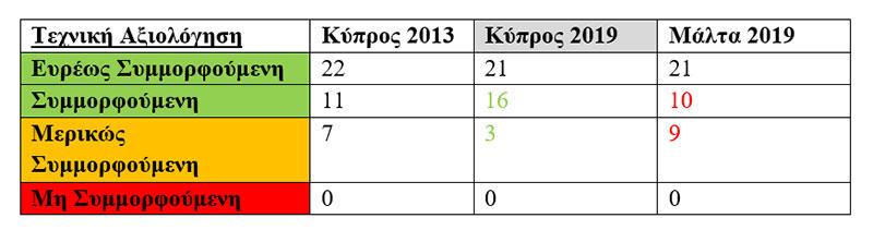 Η συνολική έκθεση μπορεί να θεωρηθεί ως μέτρια προς ικανοποιητική αφού το σύνολο της Κυπριακής οικονομίας κρίνεται στην Τεχνική Αξιολόγηση ως πολύ καλό με μόνο τρία σχεδόν ασήμαντα σημεία από τα 40 να βρίσκει την Κύπρο ως «Μερικώς Συμμορφούμενη» με τα υπόλοιπα να την βρίσκουν ως «Συμμορφούμενη» ή ακόμα και «Ευρέως Συμμορφούμενη». Ο πιο κάτω πίνακας αντικατοπτρίζει την εικόνα της Κύπρου σε αυτή την Τεχνική αξιολόγηση και συγκρίνει τα αποτελέσματα της τόσο σε σχέση με την προηγούμενη αξιολόγηση της Moneyval που έγινε το 2013, όπως επίσης και με αυτή που έγινε στη γειτονική μας Μάλτα μόλις πριν μερικούς μήνες.