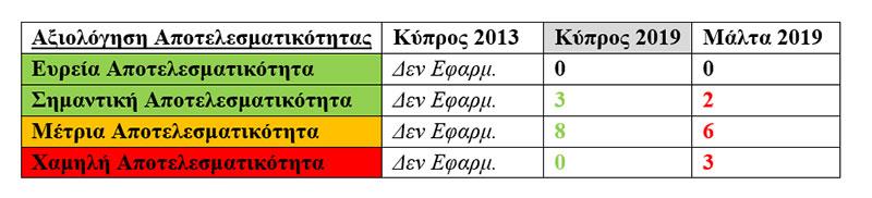 Από τα 11 συνολικά σημεία που αξιολογήθηκαν, η Κύπρος κατέδειξε «Μέτρια Αποτελεσματικότητα» σε 8 και μόνο σε 3 σημεία κατέγραψε «Σημαντική Αποτελεσματικότητα». Παρόλα ταύτα και σε αυτή τη νέα κατηγορία, η Κύπρος κατέγραψε καλύτερα αποτελέσματα από τη Μάλτα όπως διαφαίνεται από τον πιο πάνω πίνακα επιβεβαιώνοντας τη συγκριτική βελτιωμένη ποιότητα της αποτελεσματικότητας της Κυπριακής οικονομίας για πάταξη του οικονομικού εγκλήματος σε σχέση με τη Μάλτα.