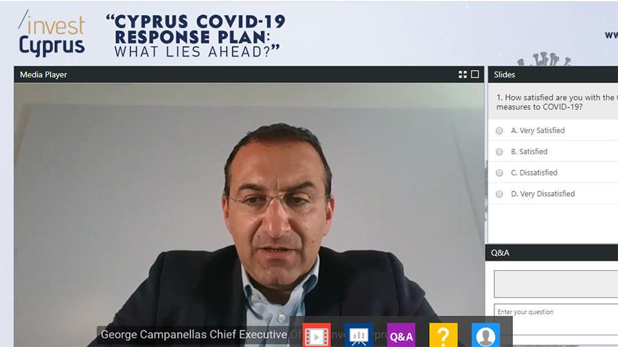 Άμεση ήταν η αντίδραση της κυβέρνησης για αντιμετώπιση της κρίσης που προκλήθηκε από την πανδημία κορωνοϊού, ανέφερε ο Γενικός Διευθυντής του Κυπριακού Οργανισμού Προώθησης Επενδύσεων, Γιώργος Καμπανέλλας. Μιλώντας ενώπιον του πρώτου online briefing που πραγματοποίησε ο Invest Cyprus με τίτλο «Cyprus – Covid-19 Response Plan: What lies ahead» με την συμμετοχή πέραν των 100 ξένων επενδυτών που δραστηριοποιούνται στην Κύπρο, ο κ. Καμπαντέλλας τόνισε πως πρωταρχικός στόχος ήταν η προστασίας της υγείας των εργαζομένων στην Κύπρο και στην συνέχεια η διασφάλιση της λειτουργίας και επιβίωσης των επιχειρήσεων.