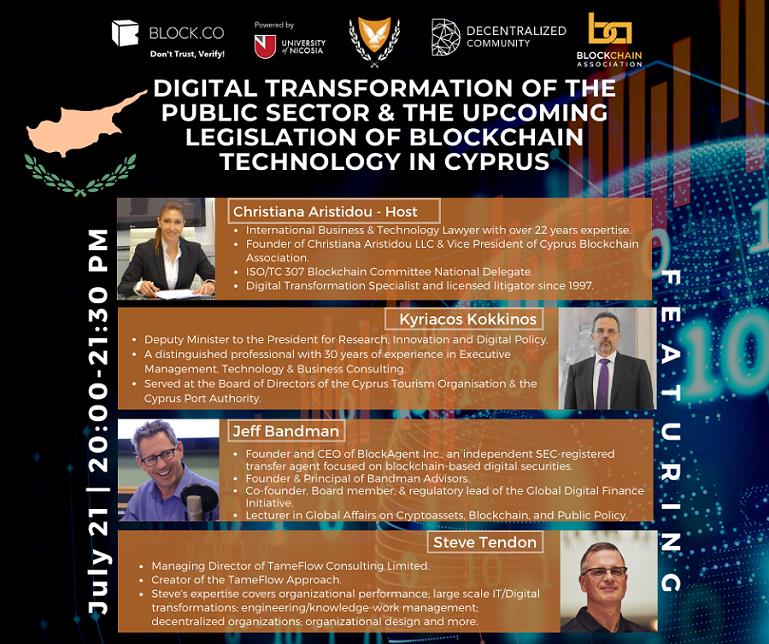 Σε αυτό το webcast, η Block.co, ο Υφυπουργός Έρευνας, Καινοτομίας και Ψηφιακής Πολιτικής της Κύπρου, κ. Κυριάκος Κοκκίνος, συνοδεύεται από τους διεθνείς εμπειρογνώμονες στο Blockchain, Jeff Bandman και Steve Tendon, για να συζητήσουν τις επιπτώσεις της εισαγωγής της τεχνολογίας Blockchain τόσο στο δημόσιο, όσο και στον ιδιωτικό τομέα.