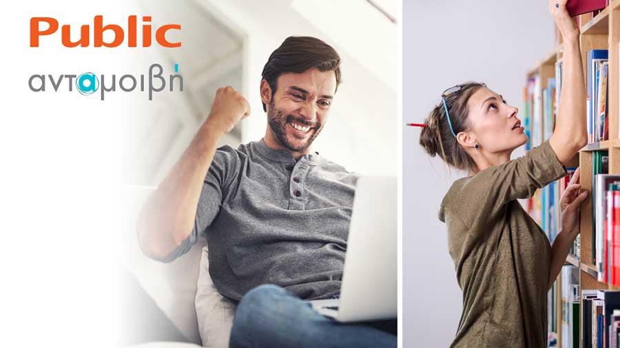 Στα Public, το κοινό μπορεί να πιστωθεί βαθμούς ανταμοιβής, επιλέγοντας ανάμεσα σε χιλιάδες επώνυμα προϊόντα τεχνολογίας και πολιτισμού. Στους διαδρόμους των έξι καταστημάτων Public σε όλη την Κύπρο και στο public-cyprus.com.cy, μικροί και μεγάλοι, μπορούν να βρουν tablets, smartphones, laptops, τηλεοράσεις, action cameras, βιβλία, παιχνίδια, σχολικά είδη, χαρτικά και γραφική ύλη, ταινίες, μουσική, video games και όσα κάνουν τη ζωή μας πιο άνετη και πιο ενδιαφέρουσα.