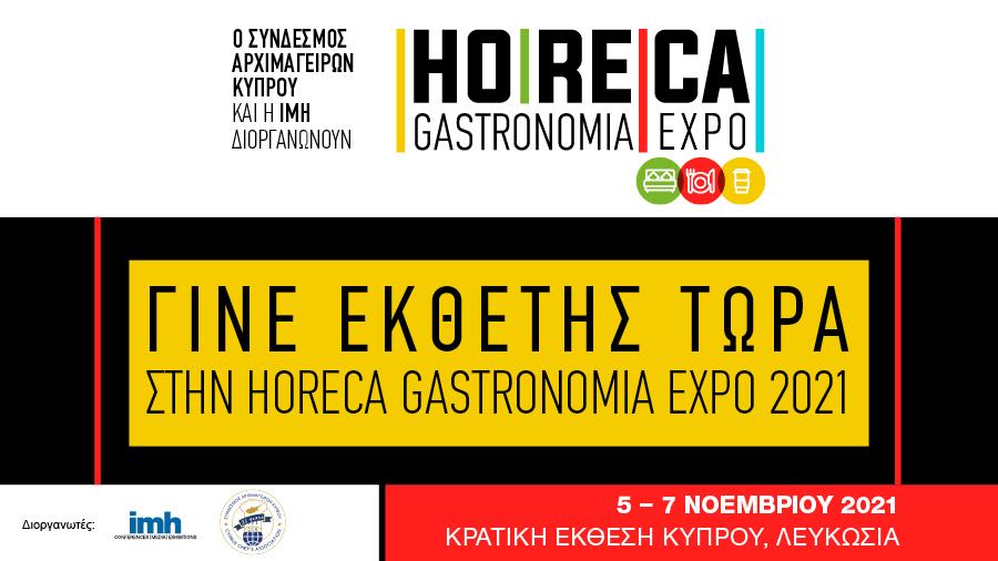 Ο Σύνδεσμος Αρχιμαγείρων Κύπρου σε συνεργασία με την IMH διοργανώνουν την HORECA-Gastronomia Expo 2021, την μεγαλύτερη έκθεση προϊόντων και υπηρεσιών που αφορούν στον εξοπλισμό και στην τροφοδοσία επιχειρήσεων οι οποίες δραστηριοποιούνται στην τουριστική βιομηχανία, καθώς και στον χώρο της μαζικής εστίασης στην Κύπρο. Η έκθεση θα πραγματοποιηθεί από τις 5 έως τις 7 Νοεμβρίου 2021, στους χώρους της Κρατικής Έκθεσης Λευκωσίας.