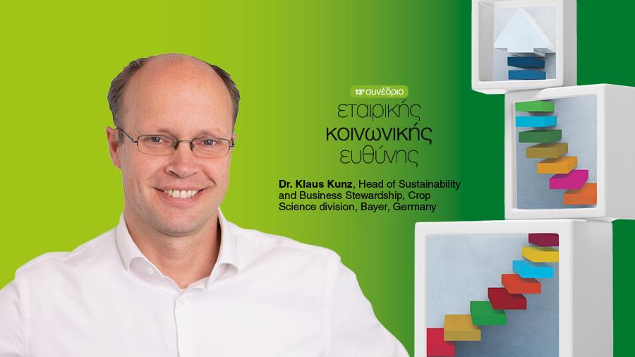 Ο Dr. Klaus Kunz Bayer Γερμανίας θα μιλήσει ενώπιον του 13ου Συνεδρίου Εταιρικής Κοινωνικής Ευθύνης, για το πώς μπορούμε να οικοδομήσουμε πιο ανθεκτικά συστήματα τροφίμων, να επιταχύνουμε τις καινοτομίες που βασίζονται στη βιώσιμη ανάπτυξη και να αναπτύξουμε νέα επιχειρηματικά μοντέλα που μπορούν να ανταμείψουν τους παραγωγούς για τις υπηρεσίες τους στο οικοσύστημα.