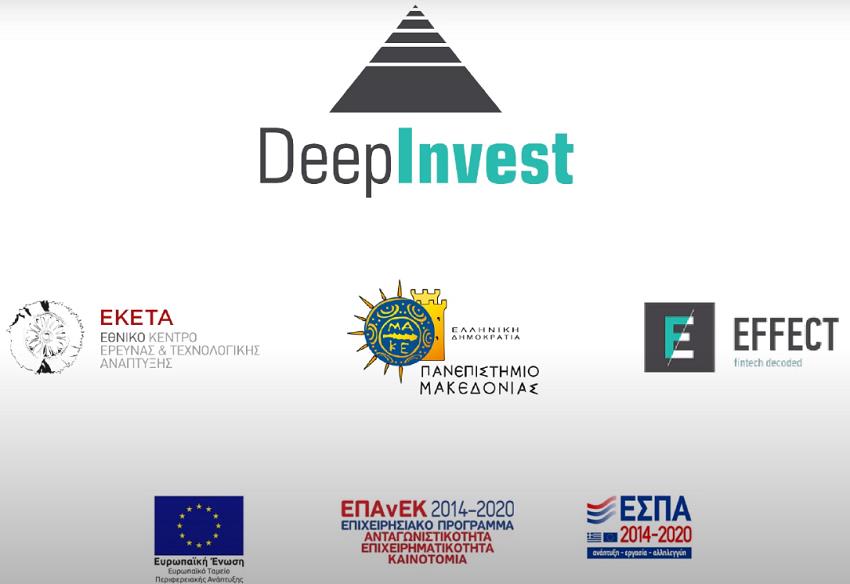 Το έργο DeepInvest, αποσκοπεί στην ανάπτυξη του ελληνικού robo-advisor που θα εισάγει την καινοτομία στην σύνθεση και στη διαχείριση των επενδυτικών χαρτοφυλακίων υλοποιώντας πρωτοποριακά μοντέλα μηχανικής μάθησης για τη δημιουργία ενός σύγχρονου εργαλείου διαχείρισης και σύνθεσης χαρτοφυλακίου.