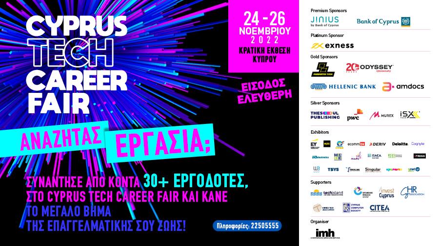 Η ΙΜΗ διοργανώνει το Cyprus Tech Career Fair στις 24-26 Νοεμβρίου 2022 στο χώρο της Κρατικής Έκθεσης στη Λευκωσία όπου οι επισκέπτες θα έχουν τη δυνατότητα να λάβουν απαντήσεις στα πιο πάνω καίρια ερωτήματα που τους απασχολούν σε ό,τι αφορά τις μελλοντικές σπουδές και επαγγελματική καριέρα είτε των ιδίων είτε των παιδιών τους.