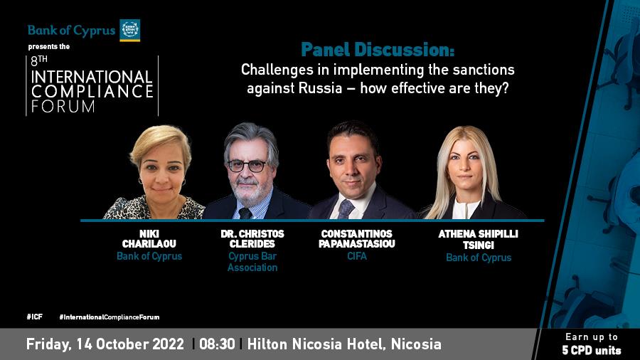 Στο πάνελ θα καθίσουν για να συνομιλήσουν μεταξύ τους ο Δρ. Χρίστος Κληρίδης, Πρόεδρος του Παγκύπριου Δικηγορικού Συλλόγου, ο Κωνσταντίνος Παπαναστασίου, Board Member - Board Treasurer του CIFA και η Αθηνά Σιηπιλλή Τσίγκη, Διευθύντρια Διεύθυνσης Διαχείρισης Περιουσίας της Τράπεζας Κύπρου. Τη συζήτηση θα συντονίσει η Νίκη Χαριλάου, Διευθύντρια Τμήματος Συμμόρφωσης Οικονομικού Εγκλήματος και Κυρώσεων της Τράπεζας Κύπρου.