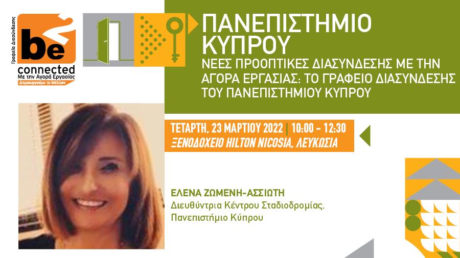 Η Έλενα Ζωμενή, Διευθύντρια του Κέντρου Σταδιοδρομίας στο Πανεπιστήμιο Κύπρου. Με σπουδές στο Πανεπιστήμιο Aix-Marseille I (Licence & Maitrise en LEA), η Έλενα Ζωμενή, εργάζεται στο Πανεπιστήμιο Κύπρου από το 1991, μετά από έξι χρόνια εμπειρίας στον ιδιωτικό τομέα. Έχει εργαστεί επίσης στο Γραφείο του Διαπραγματευτή της ένταξης της Κύπρου στην Ε.Ε. ως Λειτουργός Επικοινωνίας, καθώς και στο Ινστιτούτο Κύπρου ως Executive Director of Communication. Στο Πανεπιστήμιο Κύπρου, μεταξύ άλλων, είχε ενεργή συνεισφορά και αποφασιστικό ρόλο στο συντονισμό του πρώτου Έργου της Διασύνδεσης Πανεπιστημίων με τον Επιχειρηματικό κόσμο, το 2008, όπως επίσης και στο Έργο Διασύνδεσης Πανεπιστημίων με την αγορά εργασίας.