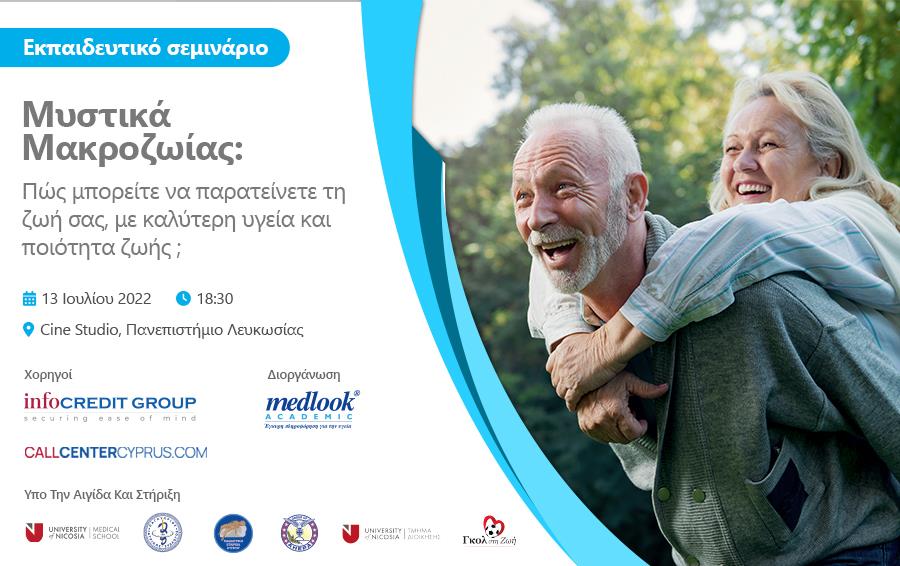 Στα πλαίσια του προγράμματος διοργανώνεται το εκπαιδευτικό σεμινάριο «Μυστικά Μακροζωίας: Πώς μπορείτε να παρατείνετε τη ζωή σας, με καλύτερη υγεία και ποιότητα ζωής» την Τέταρτη 13 Ιουλίου στο Πανεπιστήμιο Λευκωσίας (Cine Studio), στις 18:30.. Ο αθλητισμός, η σωματική άσκηση και γενικά τα σπορ έχουν καθοριστικό ρόλο για την ευτυχισμένη μακροζωία και για αυτό θα είναι σημαντικότατο μέρος του σεμιναρίου.
