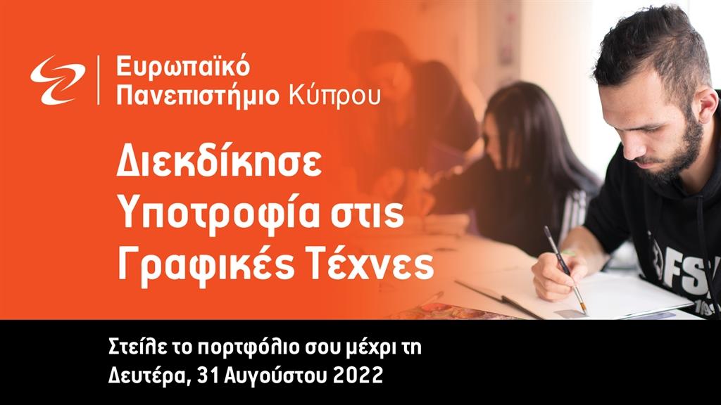 Το Τμήμα Τεχνών του Ευρωπαϊκού Πανεπιστημίου Κύπρου ανακοινώνει ότι θα παραχωρηθούν δέκα (10) υποτροφίες κατά το ακαδημαϊκό έτος 2022-2023. Οι υποτροφίες θα παραχωρηθούν μετά από αξιολόγηση πορτφόλιο και είναι ύψους 25% για όλα τα έτη φοίτησης.