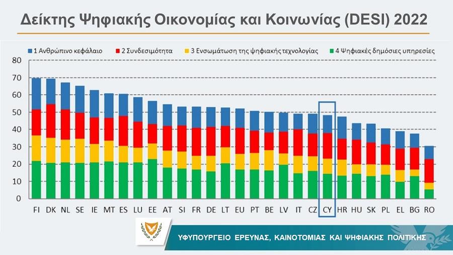 Με σταθερά βήματα μπροστά συνεχίζει την πορεία εκσυγχρονισμού της η Κύπρος, βελτιώνοντας για ακόμη μία φορά την κατάταξή της στον Δείκτη Ψηφιακής Οικονομίας και Κοινωνίας (DESI), που αξιολογεί την πρόοδο των κρατών μελών της Ευρωπαϊκής Ένωσης (ΕΕ) ως προς τη μετάβασή τους στη ψηφιακή εποχή.