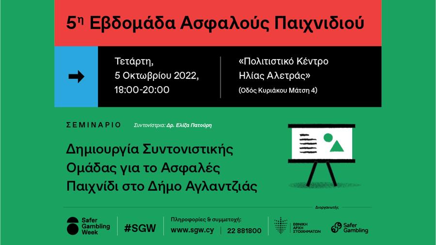 Σκοπός του Σεμιναρίου είναι η εκπαίδευση και συντονισμός μελών του Δήμου Αγλαντζιάς σε θέματα που αφορούν στο Ασφαλές Παιχνίδι. Στο Σεμινάριο θα συζητηθούν οι λειτουργικές προδιαγραφές για τη δημιουργία συντονιστικής ομάδας και ανάλυση των διαφορών μεταξύ παθολογικού και ψυχαγωγικού τυχερού παιχνιδιού. Επιπρόσθετα, θα συζητηθούν τα αίτια προβληματικών συμπεριφορών και τρόποι πρόληψης. Τέλος, τα μέλη του Δήμου θα καλεστούν να συμμετέχουν στη δημιουργία μιας συντονιστικής ομάδας για το ασφαλές παιχνίδι εντός της κοινότητας.