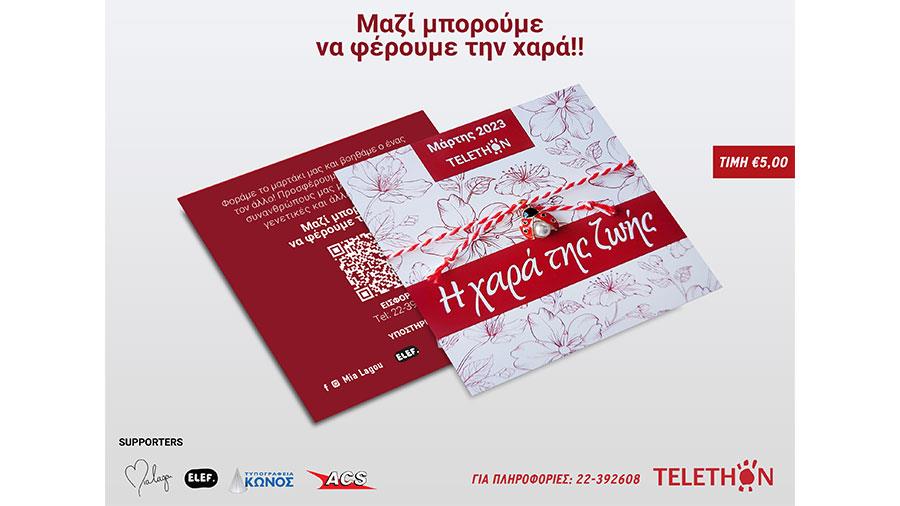 Στηρίζοντας την προσπάθεια και φορώντας το Μαρτάκι 2023, με περηφάνια δίνουμε απλόχερα ελπίδα. Δίνουμε Χαρά στη Ζωή! Η ομάδα του TELETHON Κύπρου, μας προσκαλεί να φορέσουμε το πιο φωτεινό μας χαμόγελο και να διαδώσουμε τον σκοπό, τόσο με τη χρήση του βραχιολιού, όσο και με την ανάρτηση φωτογραφιών του στα Μέσα Κοινωνικής Δικτύωσης, κάνοντας Tag τους λογαριασμούς της δημιουργού Mia Lagou, του TelethonCyprus (Facebook) / Telethon_Cyprus (Instagram) και του Συνδέσμου Μυοπαθών Κύπρου, χρησιμοποιώντας τα Hashtags #telemartis2023, #martakizwis #telethoncyprus