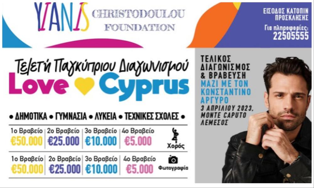 Στην αναβάθμιση σχολείων της Κύπρου θα συμβάλει το ποσό των 180.000 ευρώ που προσέφερε το Yianis Christodoulou Foundation στο πλαίσιο του διαγωνισμού LOVE CYRPUS. Η υποβολή πέραν των 600 αξιολογότατων έργων που συγκίνησαν με την προσπάθεια, καινοτομία, δημιουργικότητα και πολυχρωμία ιδεών τους, «ανάγκασε» το Φ.Ι. Yianis Christodoulou Foundation να αυξήσει τα έπαθλα σε 8 (από 6) με αντίστοιχη αύξηση των συνολικών βραβείων σε €180,000 από €170,000 που είχαν αρχικά καθοριστεί, δηλαδή, €50Κ, €25Κ, €10Κ και €5Κ σε κάθε κατηγορία (φωτογραφία / βίντεο).