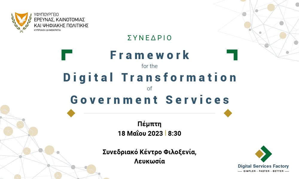 Το συνέδριο, με τίτλο «Framework for the Digital Transformation of Government Services», θα διεξαχθεί την Πέμπτη, 18 Μαΐου 2023, στις 8:30 π.μ., στο Συνεδριακό Κέντρο Φιλοξενία, στη Λευκωσία.
