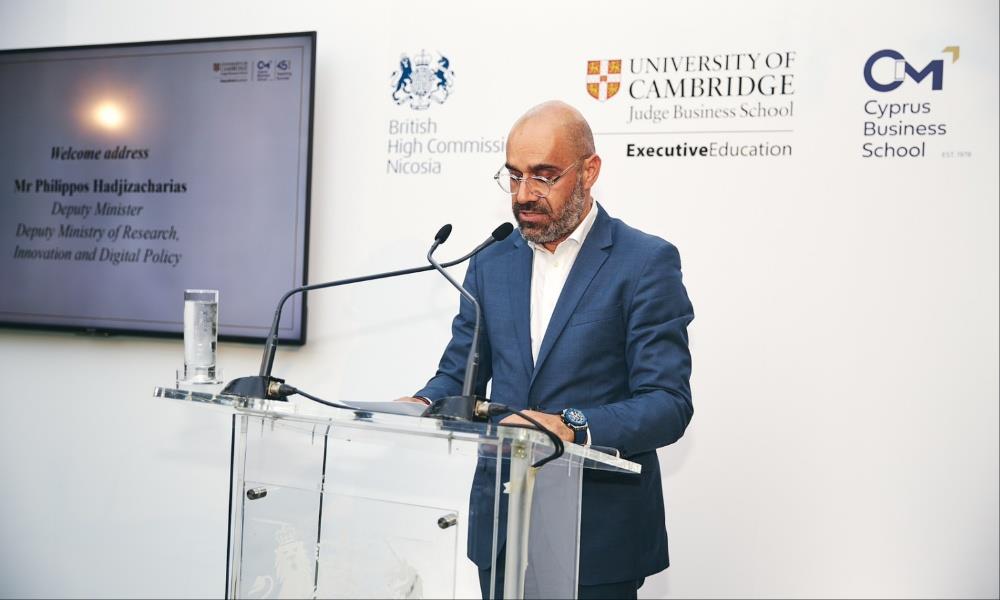 Τη σπουδαιότητα της συνεργασίας ανάμεσα σε CIM-Cyprus Business School και του Judge Business School, Executive Education, University of Cambridge, τόνισε μέσα από χαιρετισμό του ο Υφυπουργός Καινοτομίας, Έρευνας και Ψηφιακής Πολιτικής, Φίλιππος Χατζηζαχαρίας ο οποίος μίλησε για τη σπουδαία συνδρομή του ακαδημαϊκού ιδρύματος στις κοινές προσπάθειες μετατροπής της χώρας σε tech hub.