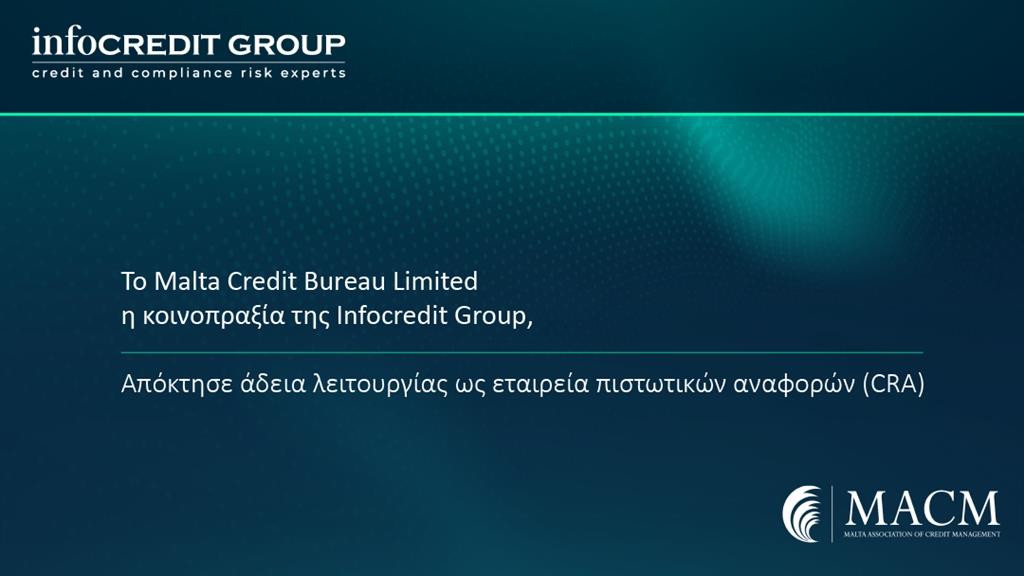 Η Infocredit Group ανακοινώνει με περηφάνια ότι το Malta Credit Bureau Limited, το οποίο αποτελεί κοινοπραξία της με το Malta Association of Credit Management έχει εξασφαλίσει με επιτυχία άδεια λειτουργίας ως εταιρεία πιστωτικών αναφορών (credit reference Agency, CRA). Αυτή το σημαντικό επίτευγμα σηματοδοτεί μια νέα εποχή στην πιστοληπτική αξιολόγηση και τη διαχείριση του κινδύνου στην περιοχή.