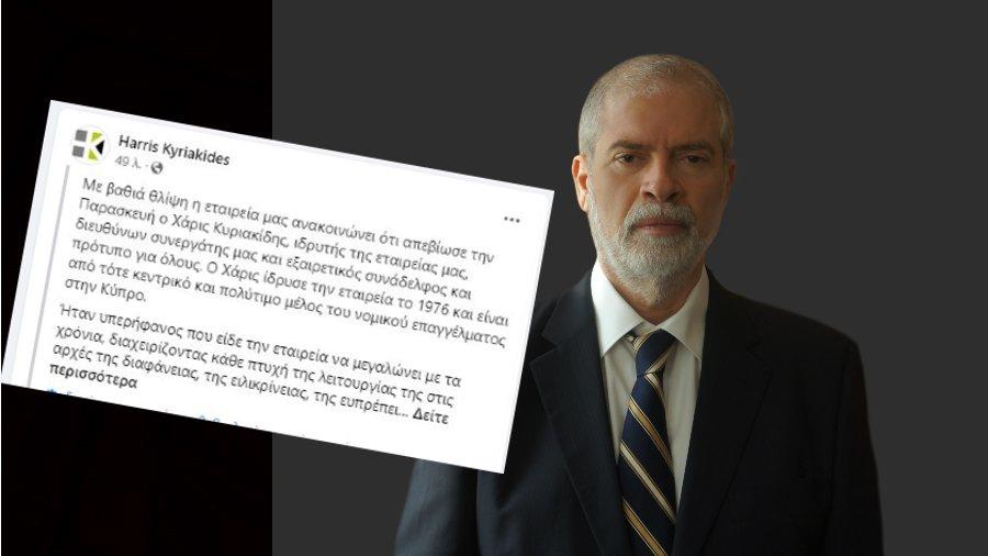 Τον θάνατο του ιδρυτή και διευθύνοντος συμβούλου του Χάρη Κυριακίδη, γνωστοποίησε και με ανάρτησή του στα μέσα κοινωνικής δικτύωσης που διαθέτει το δικηγορικό γραφείο «Harris Kyriakides».