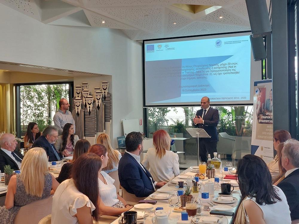 Ο κ. Παναγιώτου απηύθυνε χαιρετισμό σήμερα, σε δημοσιογραφική διάσκεψη του Παγκύπριου Δικηγορικού Συλλόγου για την πρώτη προγραμματική περίοδο 2014-2020 για το έργο Παροχής Ευκαιριών σε Νέους Πτυχιούχους Νομικής, μέχρι 29 ετών, που βρίσκονται εκτός απασχόλησης, εκπαίδευσης ή κατάρτισης (Not in Education, Employment or Training - NEETs) για πραγματοποίηση της απαιτούμενης από τον περί Δικηγόρων Νόμο άσκησης. Το έργο συγχρηματοδοτείται από το Ευρωπαϊκό Κοινωνικό Ταμείο και την Πρωτοβουλία για την Απασχόληση των Νέων.