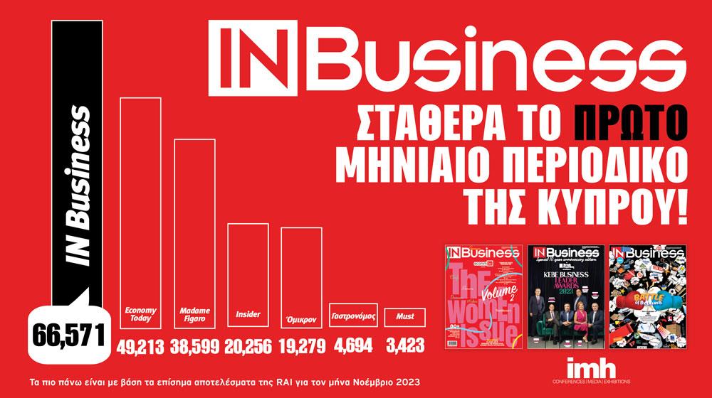 Με 66,571 αναγνώστες, το IN Business σκαρφάλωσε το Νοέμβριο του 2023 στην κορυφή της κατηγορίας των μηνιαίων περιοδικών της Κύπρου, βάσει των επίσημων αποτελεσμάτων της εταιρείας RAI.