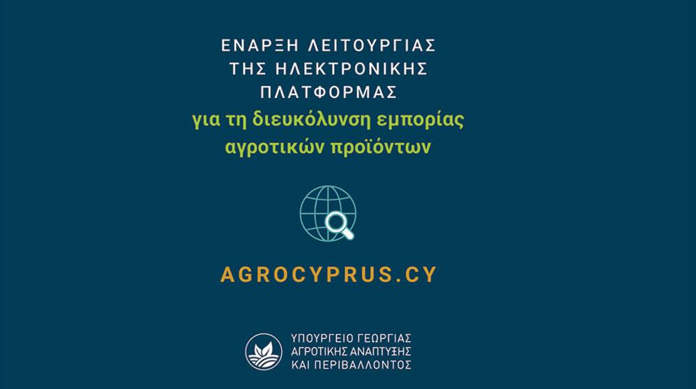 Το Υπουργείο Γεωργίας, Αγροτικής Ανάπτυξης και Περιβάλλοντος ανακοινώνει ότι τέθηκε σε λειτουργία η νέα ηλεκτρονική πλατφόρμα AGROCYPRUS.CY, η οποία έχει στόχο να διευκολύνει την εμπορία αγροτικών προϊόντων στην Κύπρο.